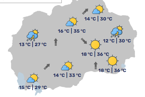Според податоците од УХМР времето утре ќе биде сончево и многу топло со умрена облачност. Ќе дува слаб до умрен, а наместа повремно засилен ветер од јужен и југозападен правец. Во текот на попладневните часови ќе има појава на краткотраен пороен дожд и грмежи. Дневниот температурен маскимум ќе биде во интервалот од најниски 14 до највисоки 36 степени целзиусови.